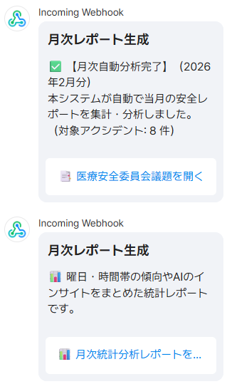 レポートは2種類。ひとつは医療安全委員会での議論に使うもの、もうひとつは「どの曜日・時間帯に事故が多かったか」などを整理した統計資料です。どちらも自動でPDFになり、LINE WORKSのボタンをタップするだけで全スタッフが確認できます。